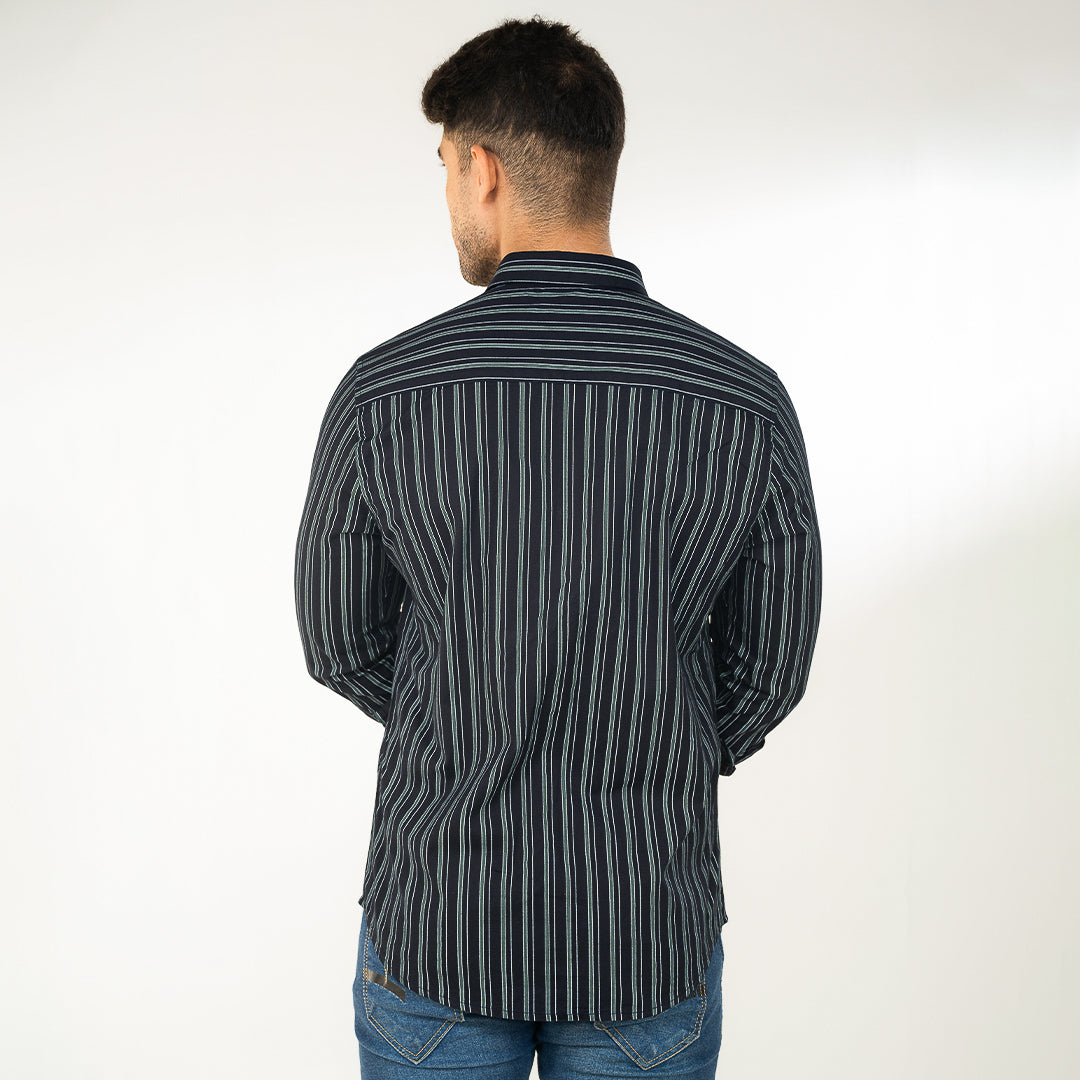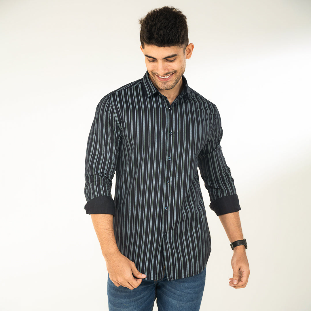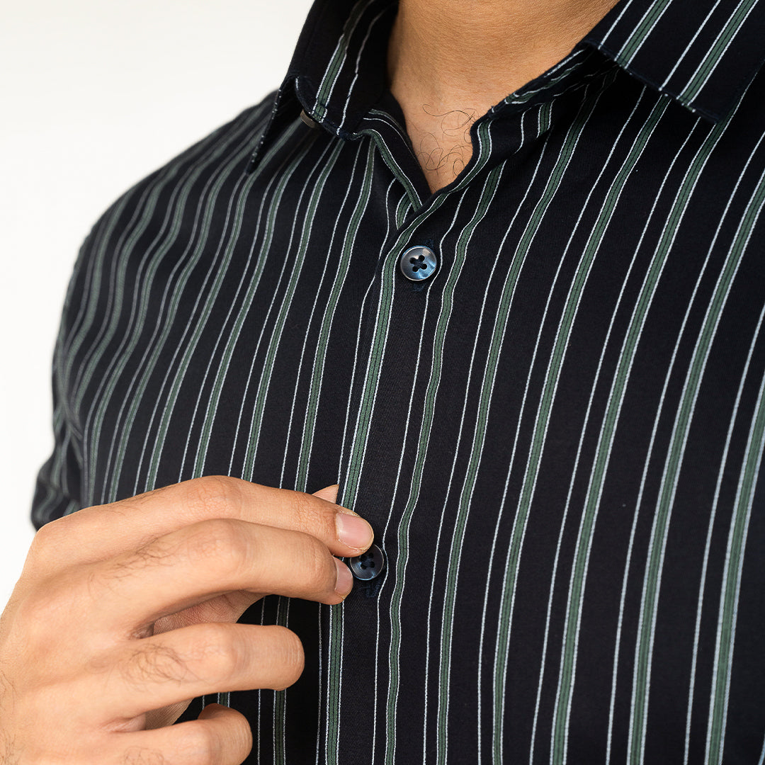 Step into the allure of the night with our 'Night Storm' shirt, an exquisite blend of sophistication and allure. The striking contrast of Navy and green stripes against a dark canvas evokes a sense of mystery and elegance. Crafted from premium fabric with meticulous attention to detail, this shirt ensures both comfort and style.